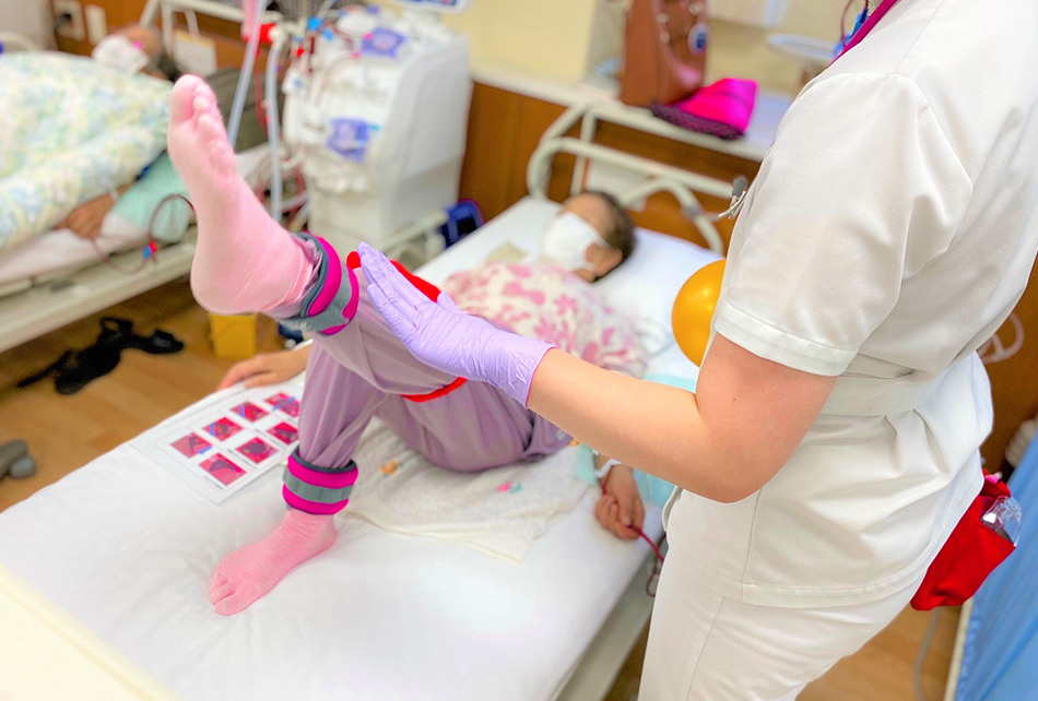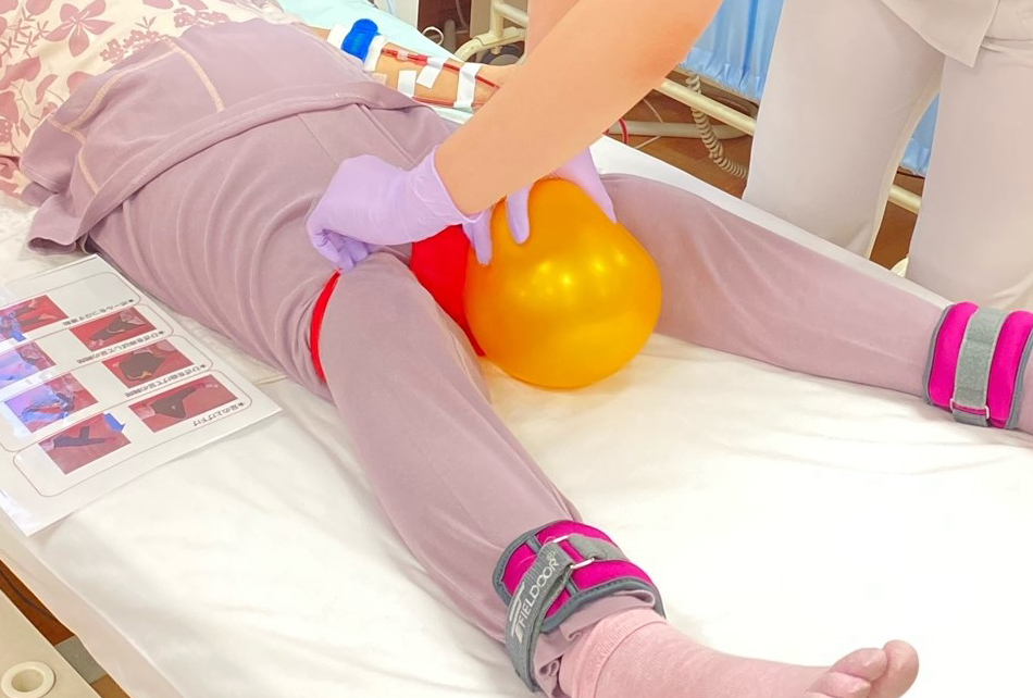 当施設でも透析中の時間を利用して、運動療法を実施しています。重りやボールを使用した筋力トレーニングや、電動サイクルマシンによる有酸素運動を行っています。
