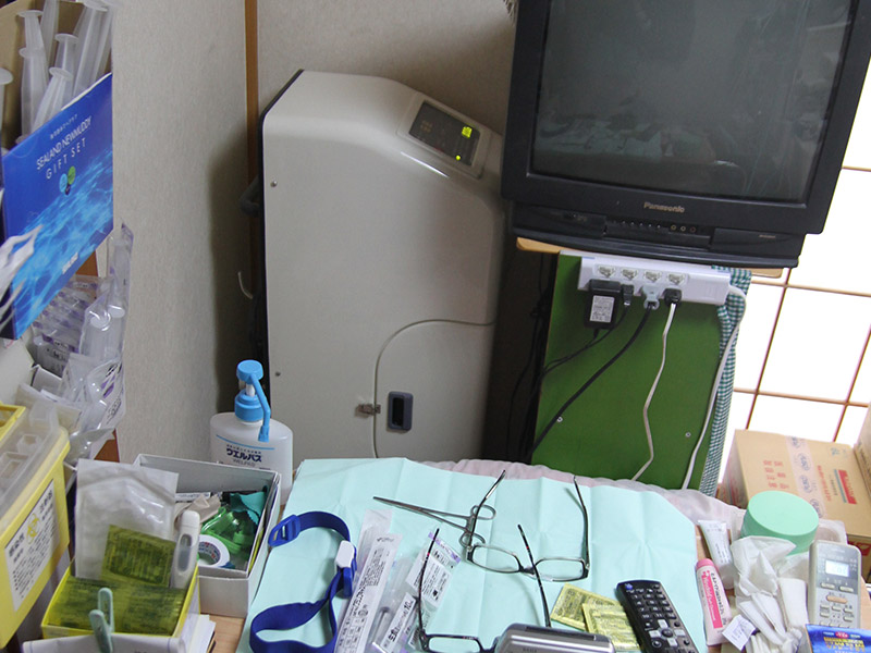 また自宅の改造も同時に進めました。自宅1階にある4畳半の和室を「マイ透析室」にする計画です。最初は4畳半に全機材が収まるか心配でしたが、透析装置と水処理装置でタタミ1畳ほど、近くのホームセンターで購入したリクライニングベッドが1畳ほど、自宅にあったテレビや棚で半畳ほど、透析材料は押し入れの下半分、と配置すると、ちょうど四畳半にきっちり収まりました。コンパクトで使いやすい「マイ透析室」が完成しました。