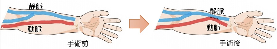 血液透析を行うためにはバスキュラーアクセス(内シャント・人工血管・カテーテルなど)が必須です。多くの場合、手首付近の動脈と静脈を結ぶ手術(自己血管内シャント)を行います。